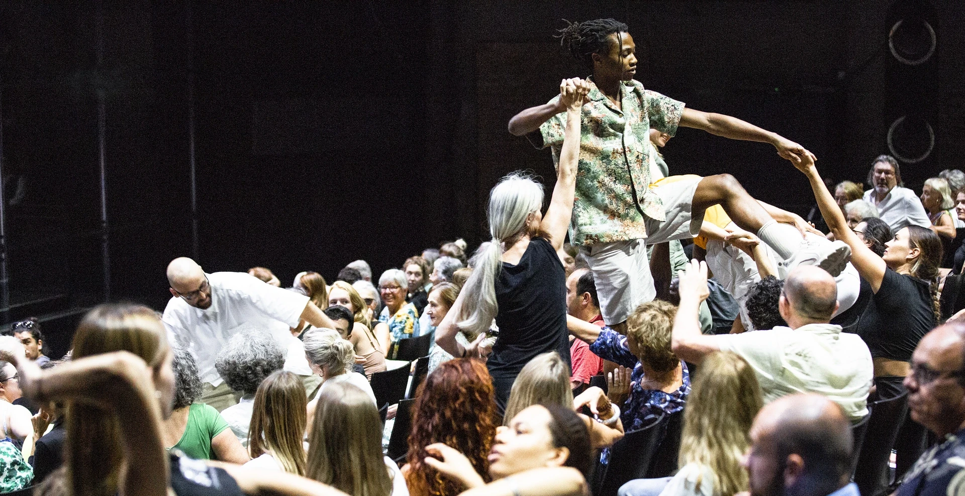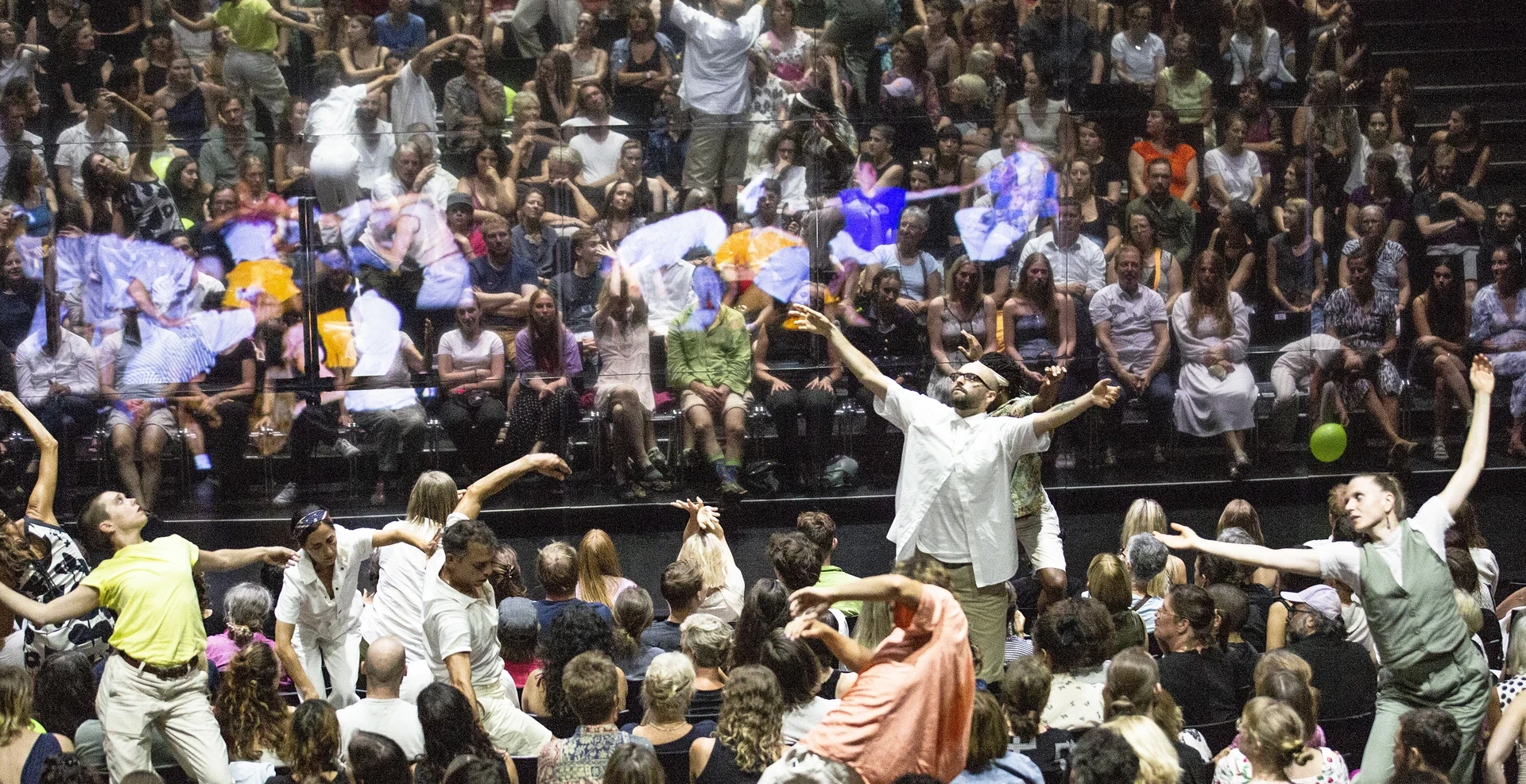 Ein Spiegel ersetzt die Bühne. Er reflektiert nicht nur die Tänzer*innen, sondern – wie ein gigantisches Selfie – die ganze Tribüne mitsamt Publikum. Der Zuschauerraum wird zum Hauptaktionsort. Im Austausch mit den Tänzer*innen rückt das Publikum ins Zentrum der Bewegung, verkörpert Bilder, trägt zur Choreografie bei. Über den Spiegel betrachten die Zuschauer*innen sich selbst und andere beim Beobachten des Experiments, dessen Mittelpunkt sie sind.