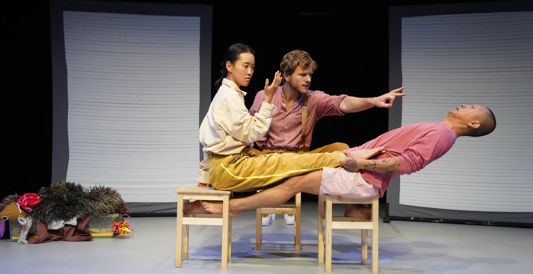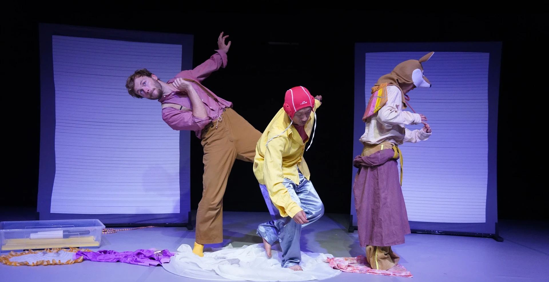 Drei Tänzer*innen lassen sich ein auf das „Spiel im Spiel“: Wer gerade ein Hut war, wird zur lebensrettenden Insel im stürmischen Meer. Wo gerade noch der Boden unberührbar war, robbt jetzt ein großer Wurm über die Bühne. Wer eben noch klein war, wird riesengroß und lässt die Muskeln spielen. Wer gerade noch gestritten hat, tanzt jetzt im Gleichklang.