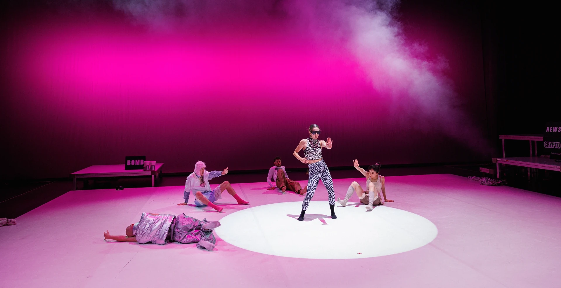 Together with five dancers who combine breaking, urban styles and contemporary dance with theatrical forms, Maria Chiara de Nobili & Alexander Miller explore how online humour shapes our feelings and beliefs. Movement and fragmented voices meet in a dissonant chorus - an echo of the sensory overload and distorted reality of social media.