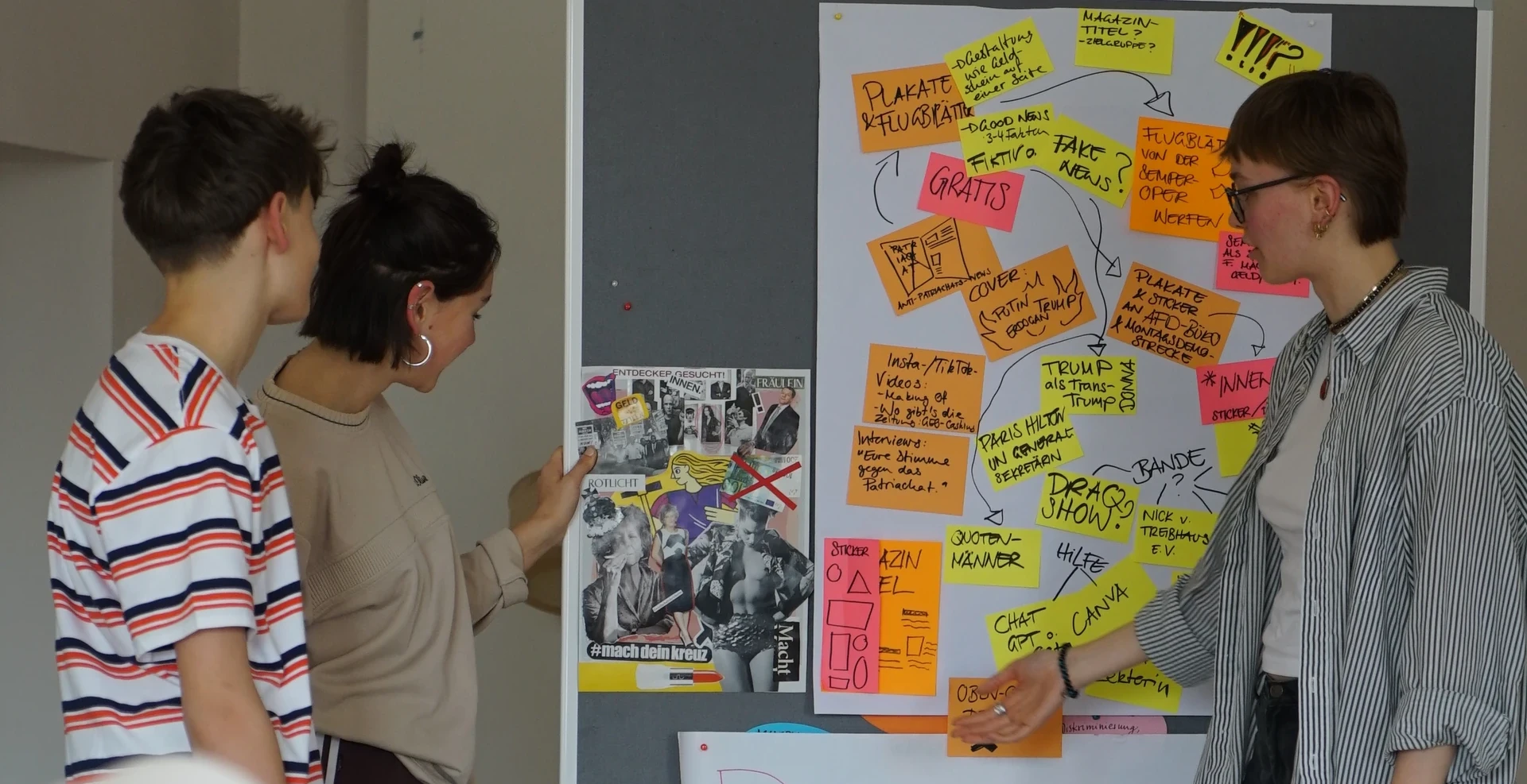 In tense encounters, the participants, supported by artistic practice, developed their political stance and tried out ways to present it creatively and visibly. They travelled through Dresden to use action art - as a direct expression of a stance - to draw attention to the issues they are working on.