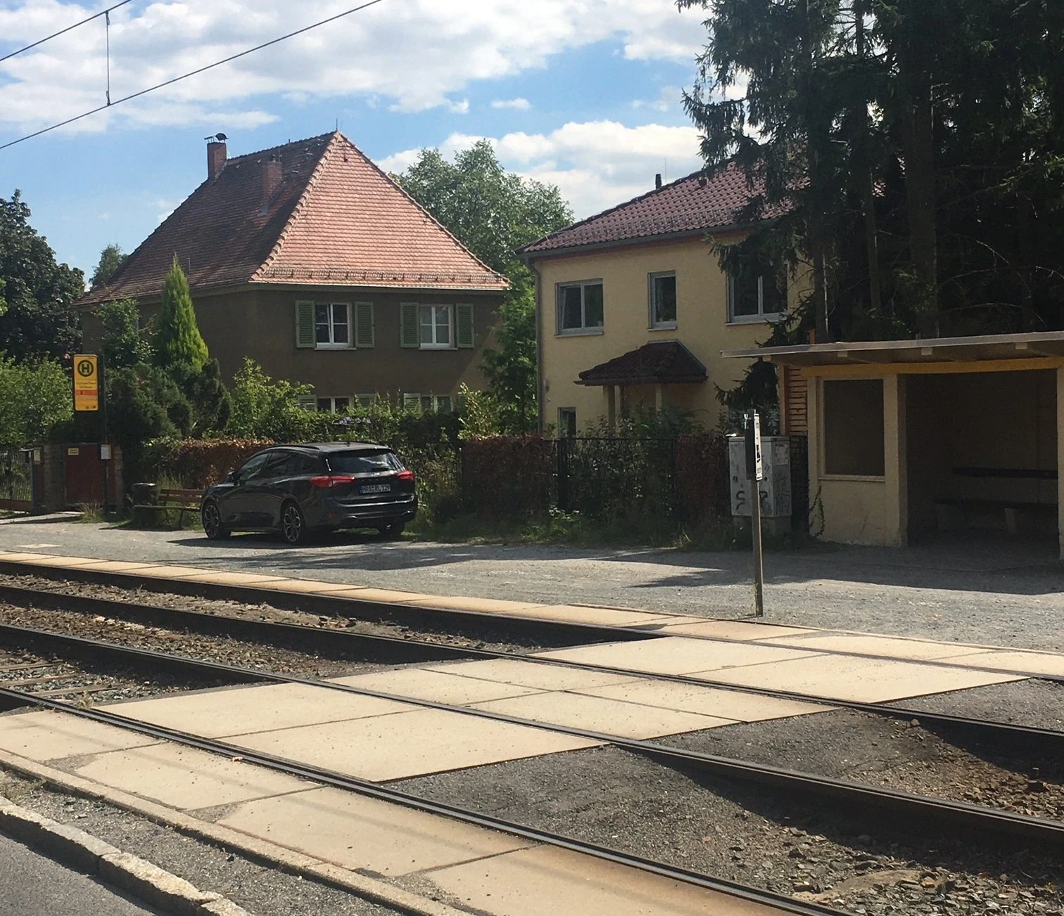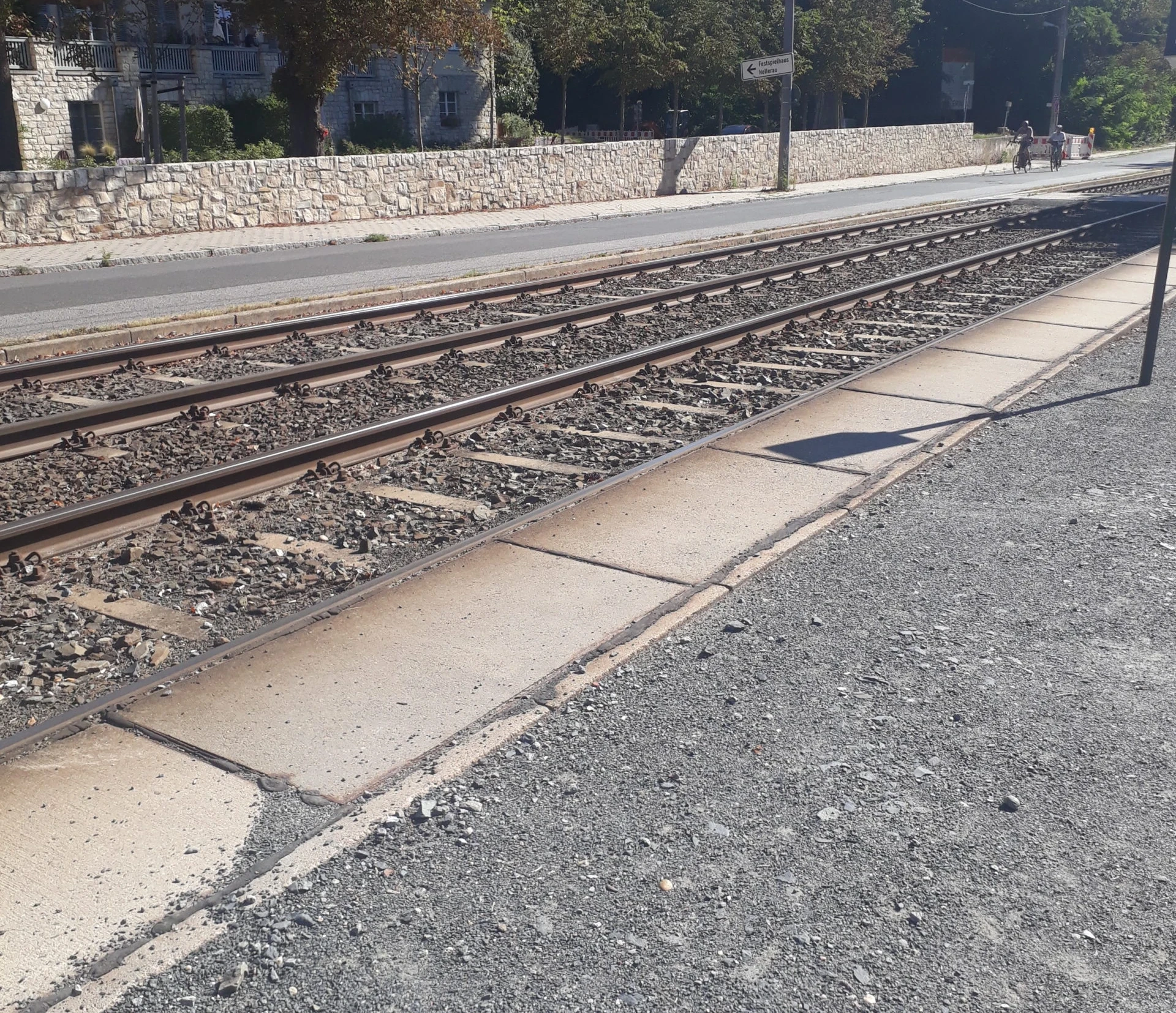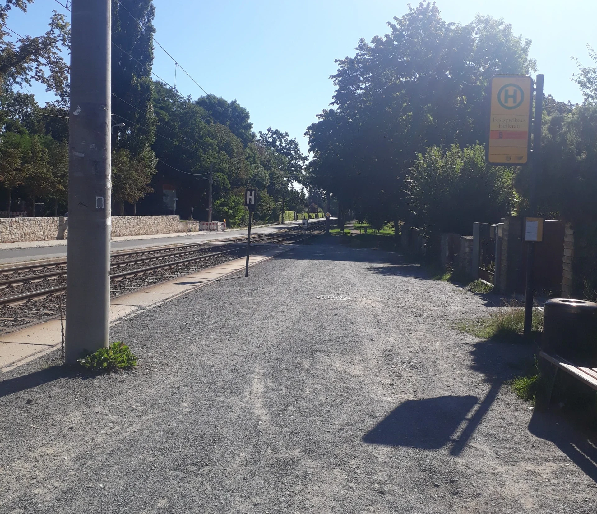 The ground at the “Festspielhaus Hellerau” stop is gravelled, which can restrict mobility for wheelchair users. An ca. 6 cm high kerb and the busy main road must be crossed. There are no traffic lights. From the bus stop “Festspielhaus Hellerau” it is ca. 330 metres to the Festspielhaus. The path is partly uneven and not easy to roll on due to the gravel surface.