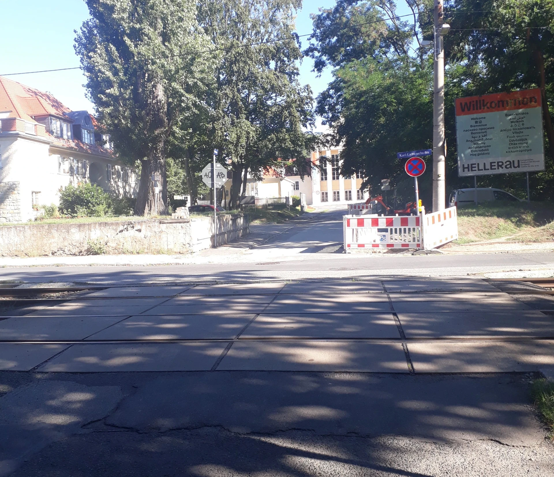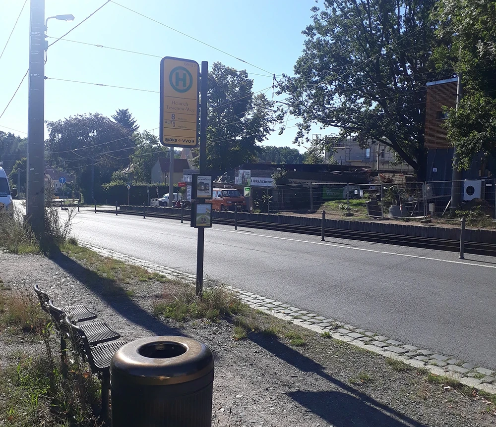 To get from the “Heinrich-Tessenow-Weg” stop to the Festspielhaus Hellerau, follow the pavement of the main road in the direction of travel on the right-hand side of the road uphill. The distance from the bus stop to the Festspielhaus is 550 metres and is therefore longer than from the bus stop “Festspielhaus Hellerau”, but easier to roll on.